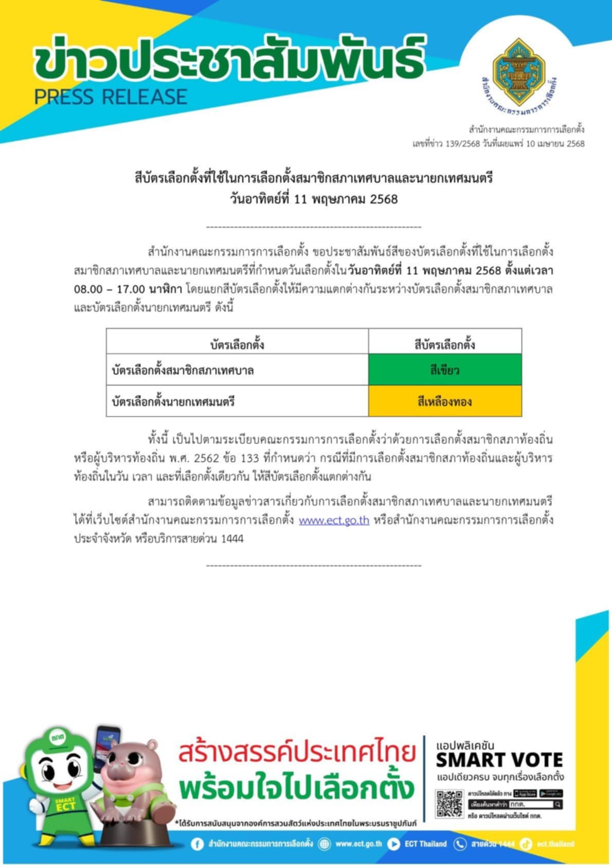 หัวข้อข่าว : สีบัตรเลือกตั้งสมาชิกสภาเทศบาลและนายกเทศมนตรี วันอาทิตย์ที่ 11 พฤษภาคม 2568